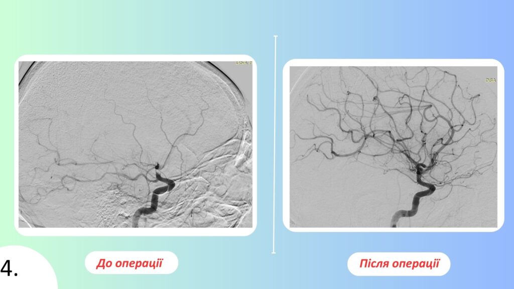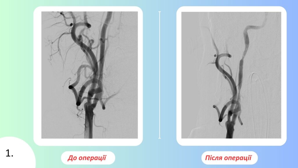 Перший клінічний випадок стосувався військовослужбовця, який перебуває на службі з 2015 року та мав тривалу цереброваскулярну патологію. На тлі атеросклеротичного ураження магістральних артерій голови у пацієнта сформувався симптомний тандемний стеноз правої внутрішньої сонної артерії, що клінічно проявлявся частими транзиторними ішемічними атаками. Після комплексного обстеження та церебральної ангіографії було ухвалено рішення про невідкладне ендоваскулярне втручання. Пацієнту виконано транслюмінальну ангіопластику зі стентуванням уражених сегментів, досягнуто повну стабілізацію кровотоку, післяопераційний період минув без ускладнень, що дало змогу продовжити підготовку до подальшого кардіохірургічного лікування.