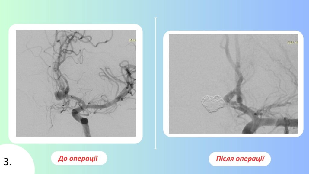 Другий випадок — 42-річний військовослужбовець із мішковидною аневризмою передньої мозкової та передньої сполучної артерій. В анамнезі — субарахноїдальний крововилив унаслідок розриву аневризми. Під час дообстеження ангіографічно підтверджено наявність аневризми з дочірніми камерами. Фахівцями Центру виконано ендоваскулярну оклюзію аневризми мікроспіралями зі стент-асистенцією. Операція та післяопераційний період пройшли без ускладнень, стан пацієнта при виписці — задовільний.