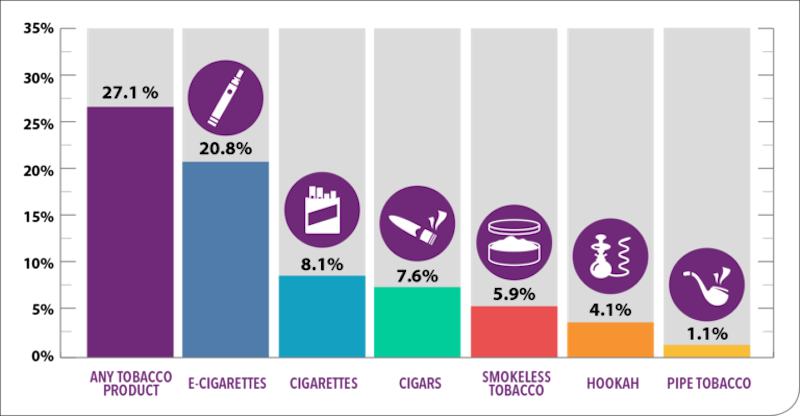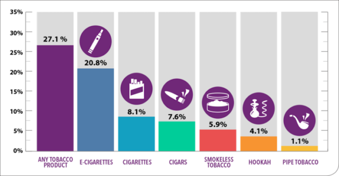 Також було встановлено, що поширеність паління серед підлітків 15-17 років зменшилася у 2 рази (з 21,2 % у 2007 р. до 12,2 % у 2015 р.). Це свідчить про те, що молодь в Україні курила все менше і навіть більше важливо, що менше з них починала палити. Ці досягнення стали можливими завдяки законодавчим змінам у сфері контролю над тютюном, які відбулися в Україні після ратифікації Рамкової Конвенції із боротьби проти тютюну (РКБТ ВООЗ). Але паління електронних сигарет та кальяну все більше набувало популярність серед молоді. Зокрема, 11,3 % підлітків 15-17 років курили кальян, а 5,5 % електронні сигарети [Павлова Д. М., Василенко О. В., 2015].