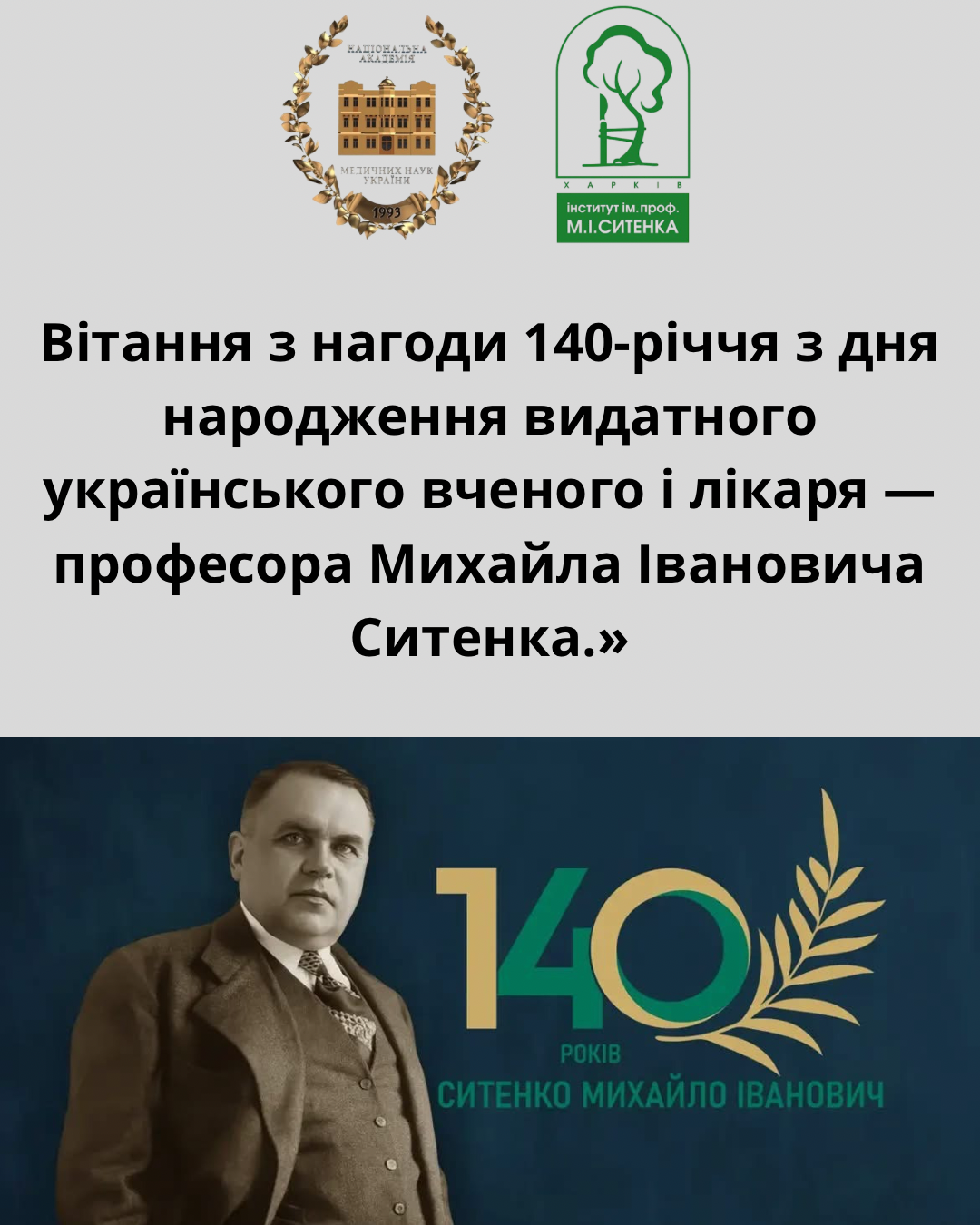 Прийміть мої найщиріші вітання з нагоди 140-річчя від дня народження видатного українського вченого, лікаря, педагога, засновника вітчизняної школи ортопедії й травматології, протезно-ортопедичної та реабілітаційної допомоги — професора Михайла Івановича Ситенка.
