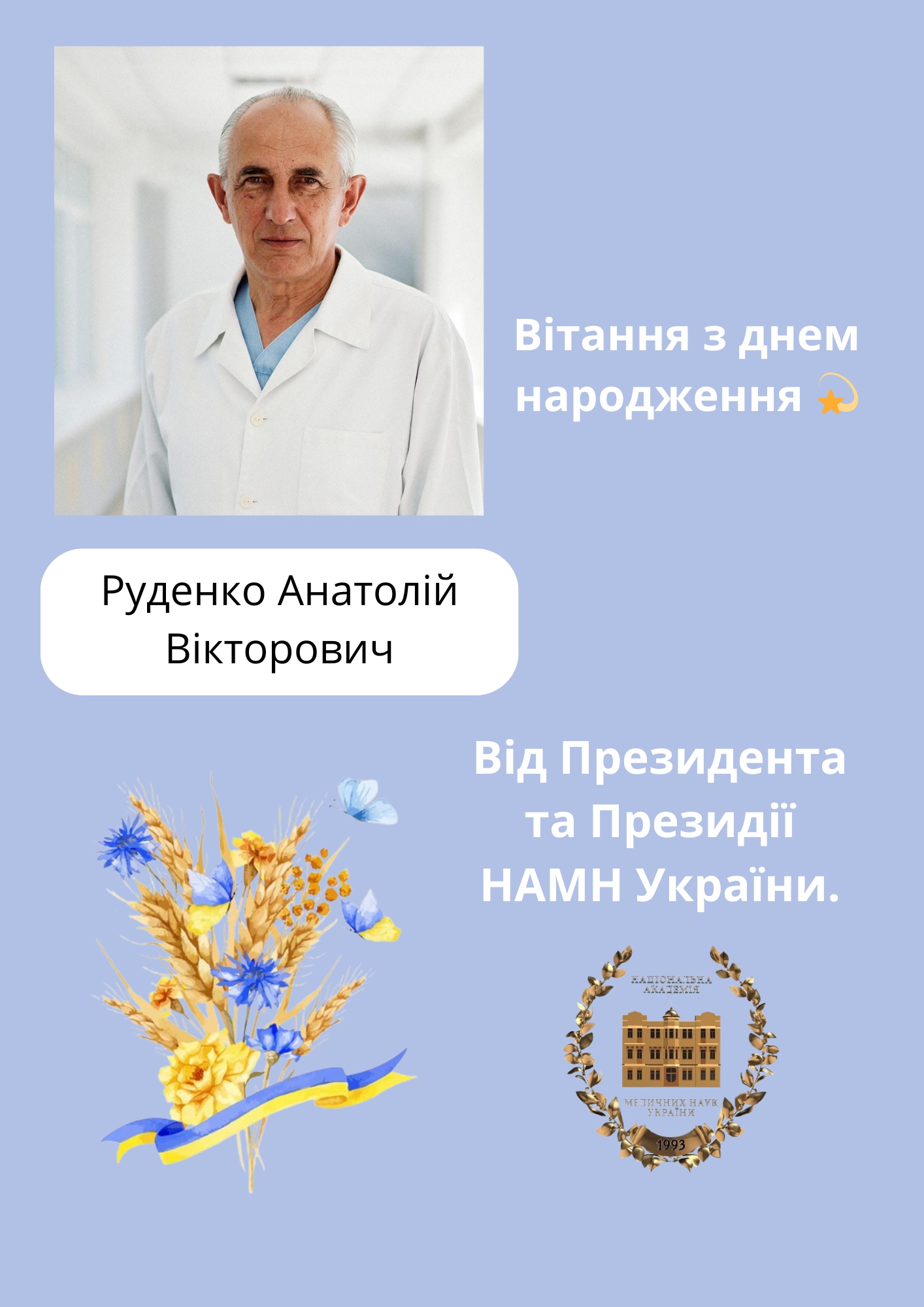 Президія Національної академії медичних наук України та Президент НАМН України Василь Лазоришинець щиро вітають академіка НАМН України Руденка Анатолія Вікторовича з днем народження!