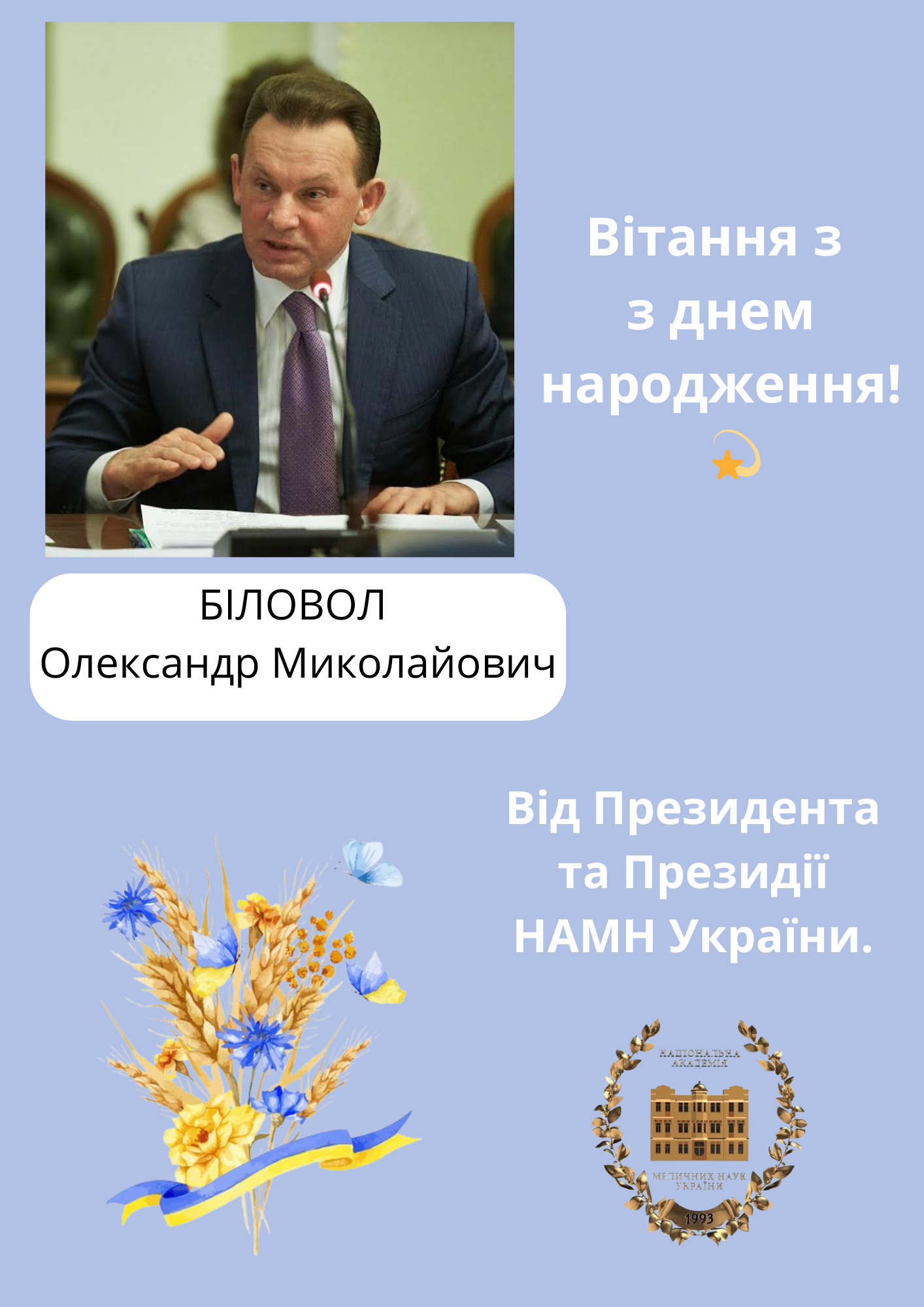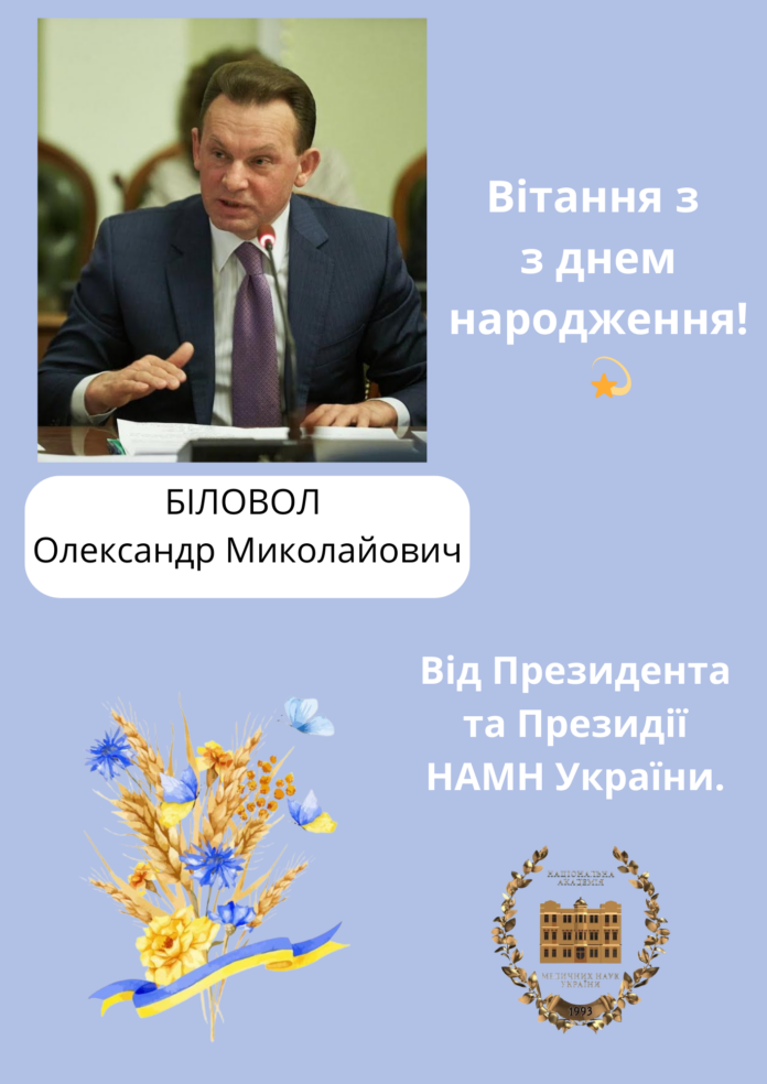 Президія та Президент НАМН України щиро вітають Вас із Днем народження та висловлюють глибоку повагу за багаторічну плідну працю, вагомий особистий внесок у розвиток медичної науки, підготовку наукових кадрів і розбудову системи охорони здоров’я України.