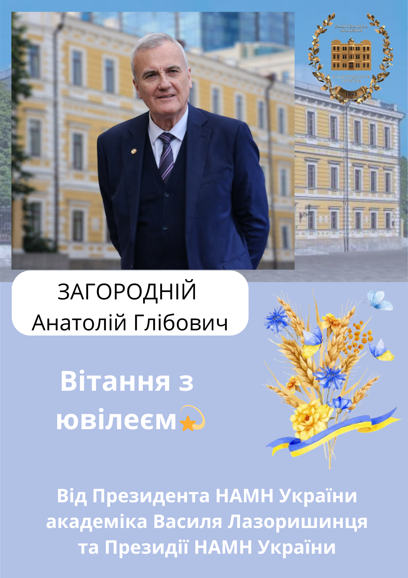 Від Президента Національної академії медичних наук України Василя Лазоришинця та Президії НАМН України прийміть щирі вітання з цією поважною датою.