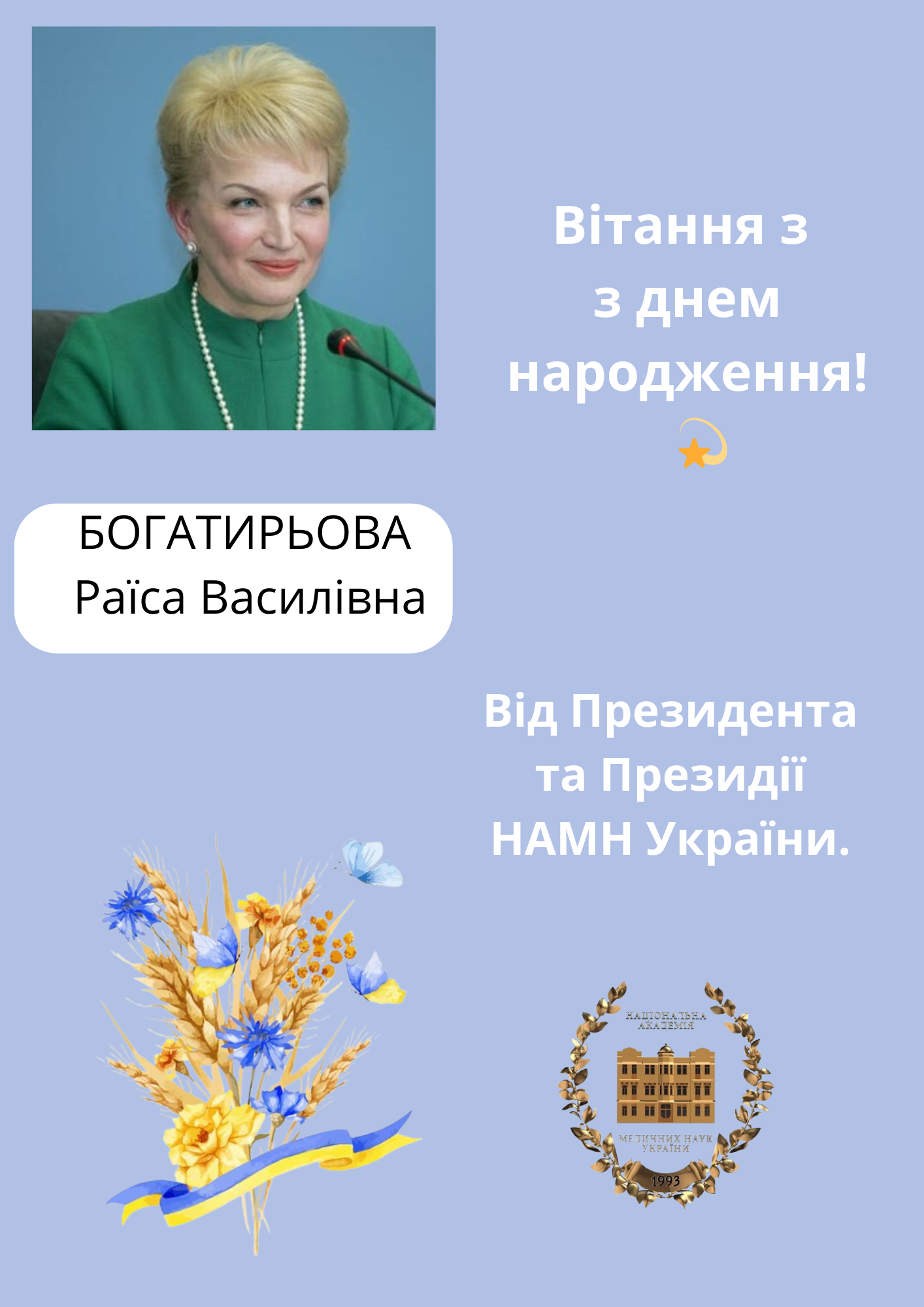 Сердечно вітаємо члена-кореспондента Національної академії медичних наук України Раїсу Василівну Богатирьову з днем народження!